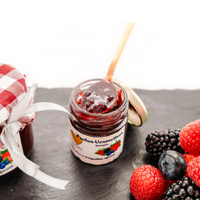 A Compota de Frutos Vermelhos Biológica combina morangos, framboesas, mirtilos e amoras, todos de agricultura biológica e colhidos no ponto ideal de maturação. Produzida artesanalmente, sem aditivos nem conservantes, mantém o sabor autêntico e a textura rica da fruta. Perfeita para barrar em pão, acompanhar panquecas e iogurtes ou rechear bolos e sobremesas. Sustentável e saudável, valoriza a natureza e a produção local em Portugal.